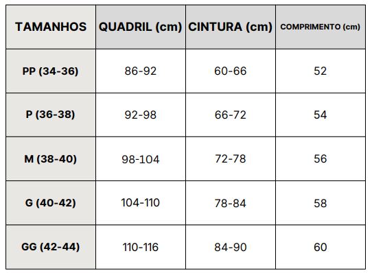 Obs.: Comprimento é medido abaixo do cós até a barra.